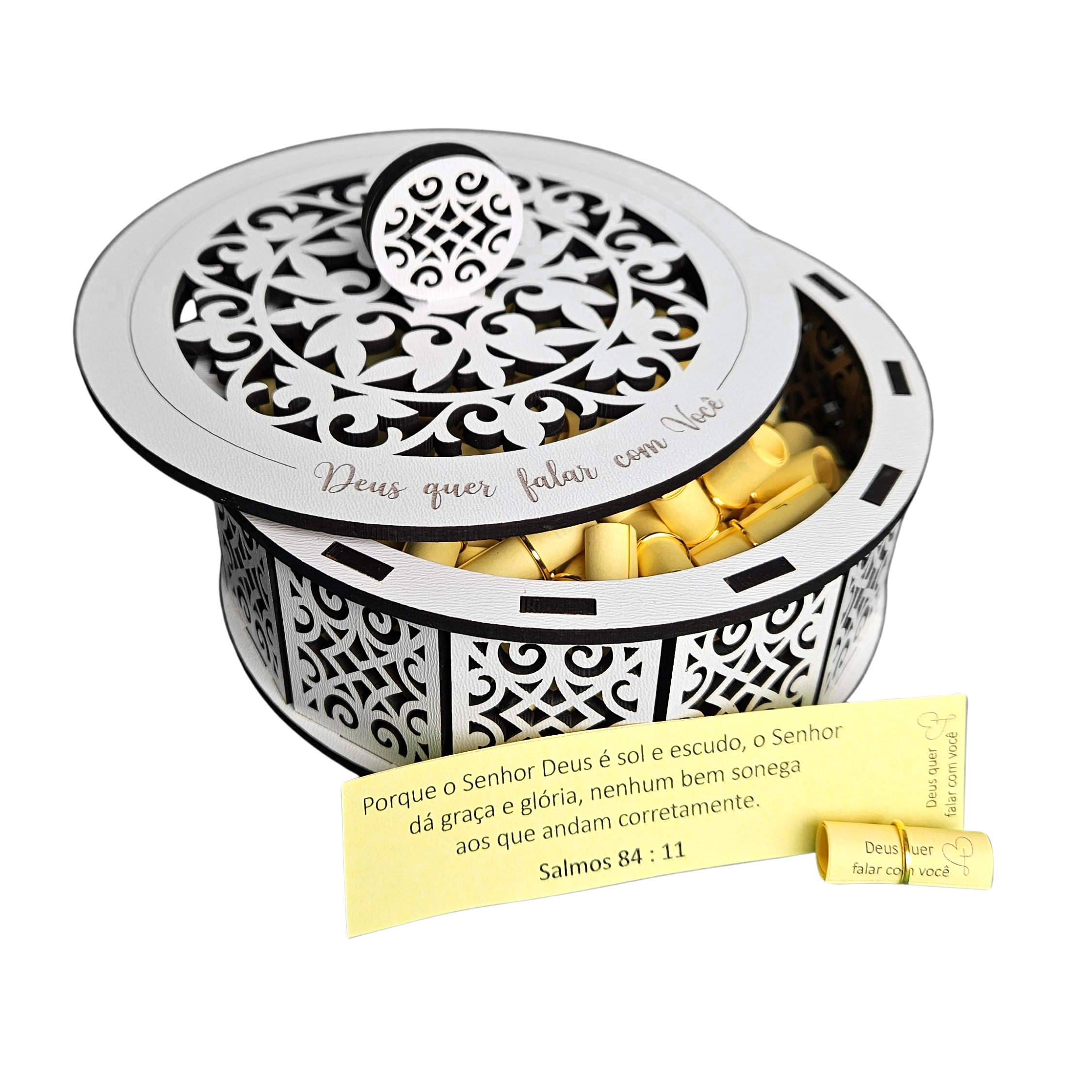 Caixa com 50 mensagens possui 9 x 5,5 cm (altura total com puxador)