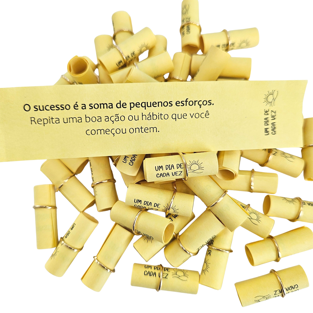Cada rolinho contém uma mensagem única de motivação e inspiração, cuidadosamente selecionada para trazer leveza e energia ao seu dia.